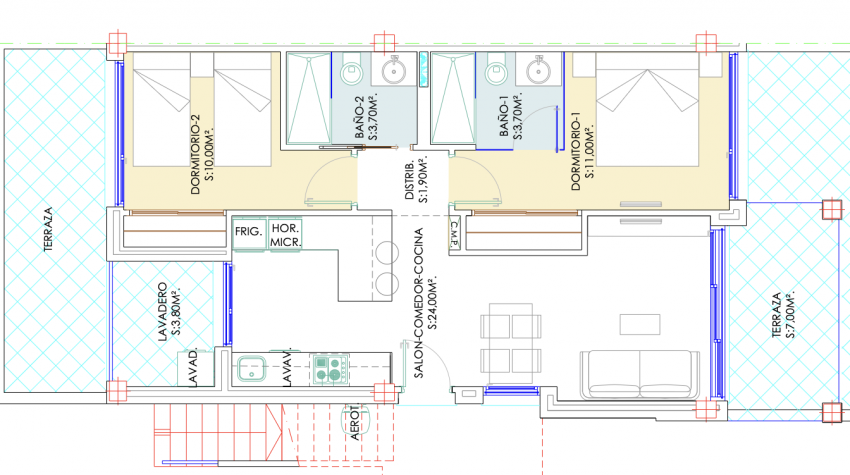 Dit nieuwe project heet Balcones de Vivi. Het appartementencomplex zal bestaan uit 208 appartementen. De appartementen worden in twee fasen opgeleverd, waarbij de eerste fase in december 2023 klaar zal zijn en de tweede fase in december 2024. Afhankelijk van het appartement kun je kiezen uit twee of drie slaapkamers. Alle appartementen hebben twee badkamers. Het complex zal slechts twee verdiepingen hoog zijn en daardoor veel zonlicht binnenlaten in de gemeenschappelijke ruimtes! Dit betekent ook dat je kunt kiezen tussen een terras op de begane grond of een dakterras op de bovenste verdiepingen. Wat je ook kiest, je hebt genoeg ruimte voor familie en vrienden. De appartementen op de begane grond hebben terrassen tussen 29-50m2. De appartementen op de bovenste verdieping hebben dakterrassen van 57m2 en een terras dat in directe verbinding staat met de woonkamer. In de appartementen met twee slaapkamers heb je een ruimte voor wasmachines. In beide types is er een grote slaapkamer met ensuite badkamer. Het is mogelijk om een ondergrondse parkeergarage en berging te kopen voor 15.000 EUR.